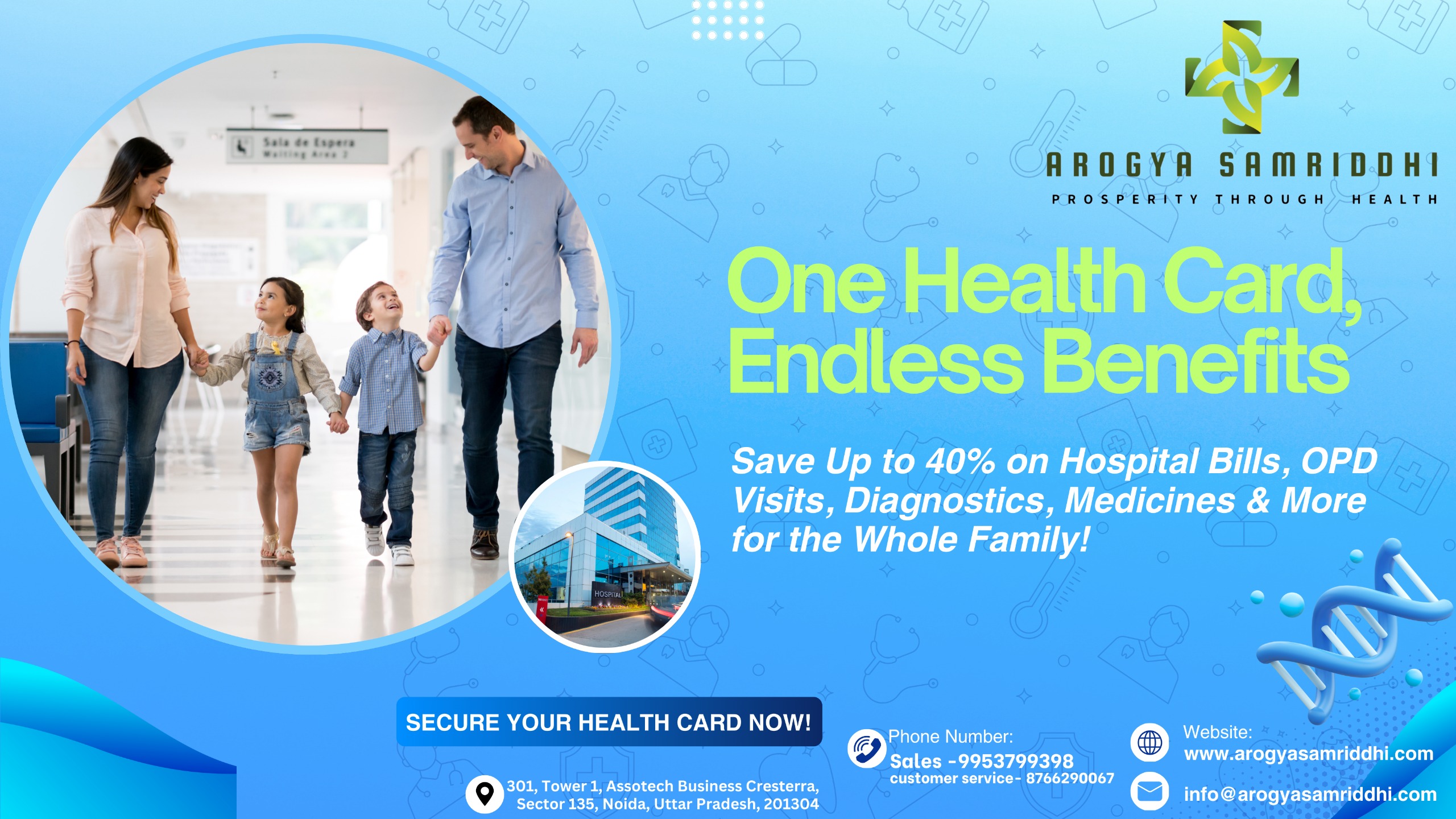 We believe good quality and affordable healthcare for a healthy and dignified living is everyone’s basic right thus, with Arogya Samriddhi card, our aim is to cater to even those individuals for whom good quality healthcare has become un-affordable post-covid, due to extremely high inflation caused by disrupted supply chains from global wars, increased global warming events, rising unemployment and shrinking disposable incomes especially in lower and middle income groups in India while immunity, health-related activity levels and Family level savings are at all-time low causing extreme uncertainties and anxiety. With Arogya Samriddhi card membership, you’re assured of getting Great quality of Healthcare from Leading institutions and experts near you at all times on a discount ranging anywhere from 10% to 40%. Meaning you’ll be visiting a hospital/doctor/diagnostic chain of your choice to get your regular procedure done but at an un-precedented discount using our card membership applicable for whole family making it an irresistible and a no-brainer deal.